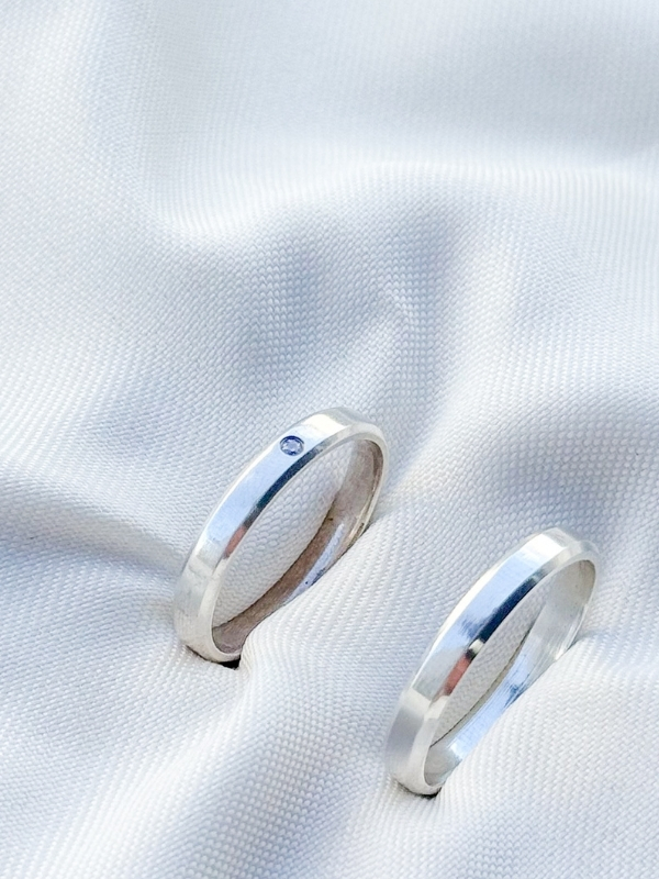 Formato Externo: Reta, bordas chanfradas e pedra de zircônia cravada no centro em um dos modelos.