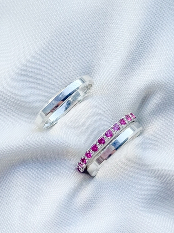 Par de Aliança Chanfrada + Solitário Pace rosa - Prata 950