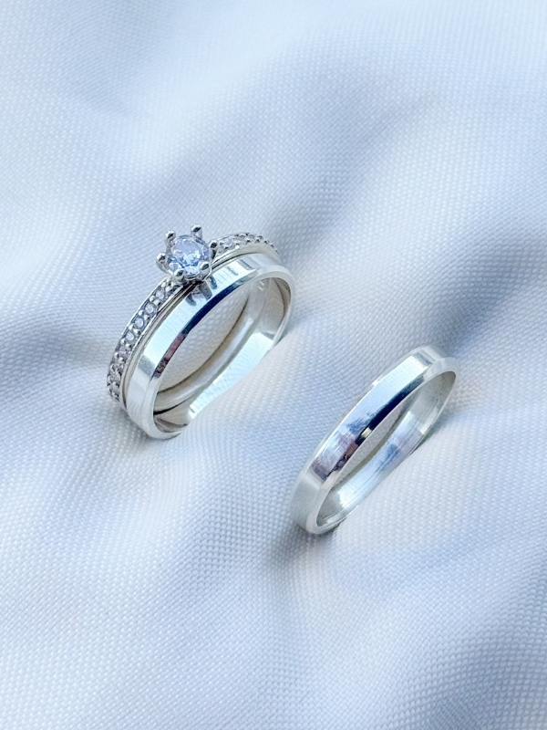 Par de Aliança Chanfrada + Solitário Romantic - Prata 950