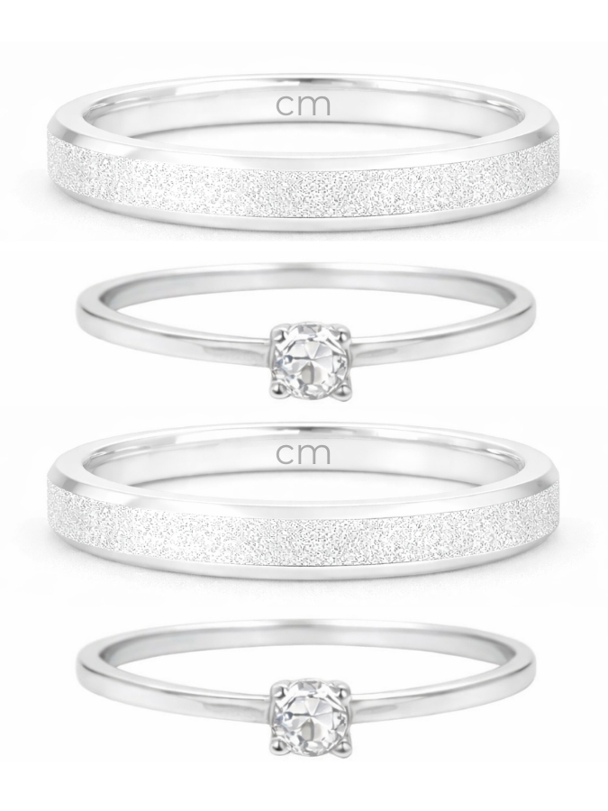 Formato Externo: Reta, diamantada, bordas chanfradas e pedra de zircônia cravada no centro em um dos modelos.