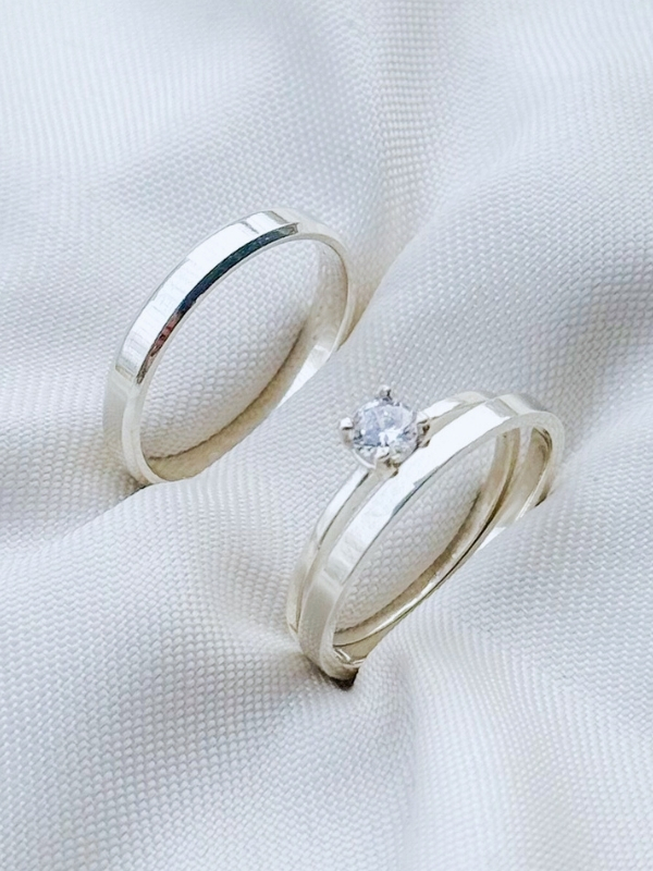 Par de Aliança Holanda e Chanfrada + Solitário Encanto Cristal - Prata 950