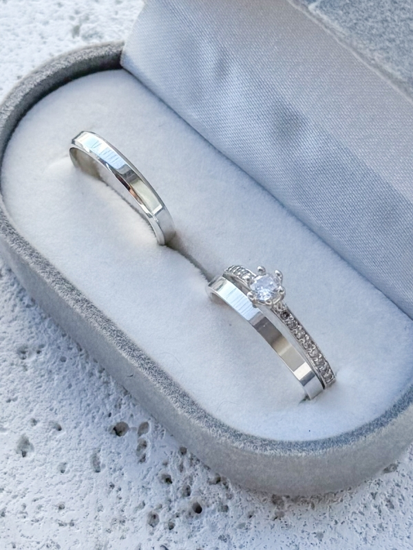 Par de Aliança Holanda e Chanfrada + Solitário Rapunzel Cristal - Prata 950