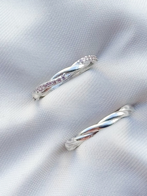 Acabamento externo: Abaulado, polido e trançado e um dos modelos cravejado com zircônias.