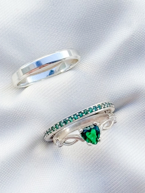 Par de Aliança Polonia com pedra verde + Solitário Love- Prata 950