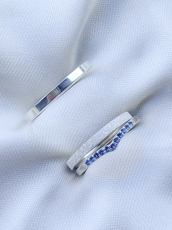 Par de Aliança Snow 2mm Diamantado + Solitário em v azul - Prata 950