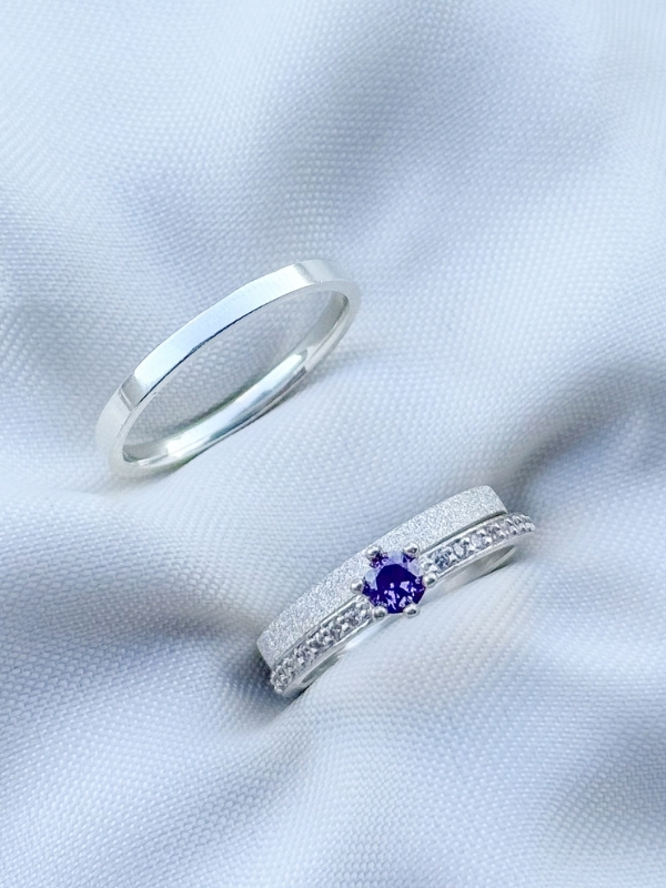 Par de Aliança Snow 2mm reto + Solitário romantic roxo - Prata 950