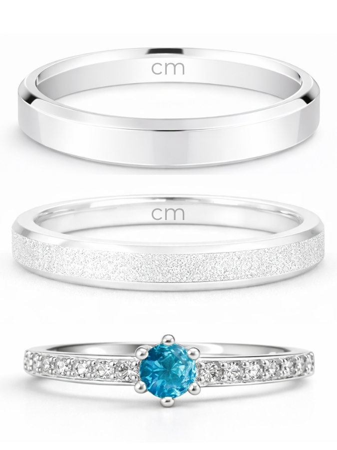 Par de Aliança Snow 3mm + Solitário Rapunzel Azul - Prata 950